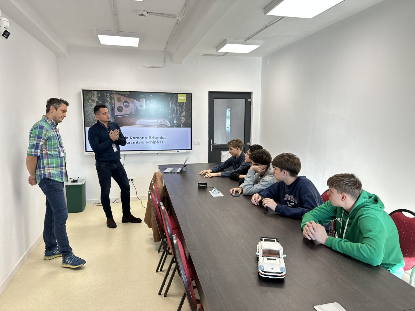 Each week, our colleagues directly engage with 9th grade students in the “Info” specialization, following a custom curriculum built together with their team. We begin from the very basics: roles that are needed in a software team, skills and pathways, and then proceed gradually toward more technical and programming-oriented topics.