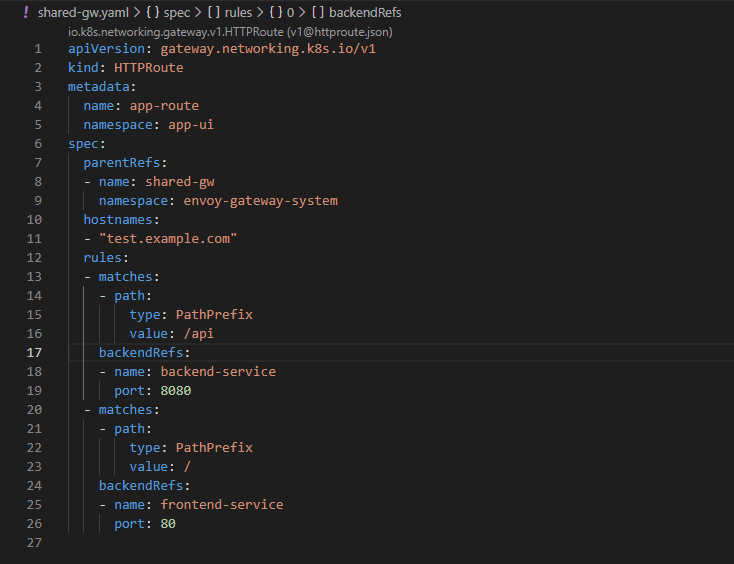 - backendRefs (lines 24-26), which specifies where to forward the request