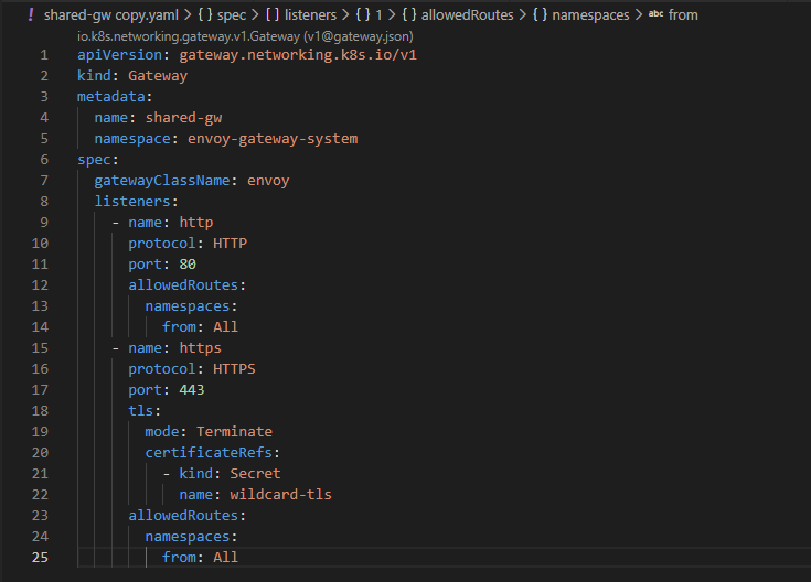 - allowedRoutes (lines 12-14 and 23-25) is a powerful control point. Many platform teams restrict it (e.g., only allow routes from specific namespaces).